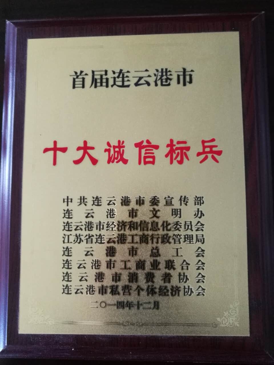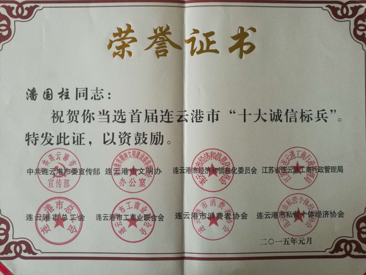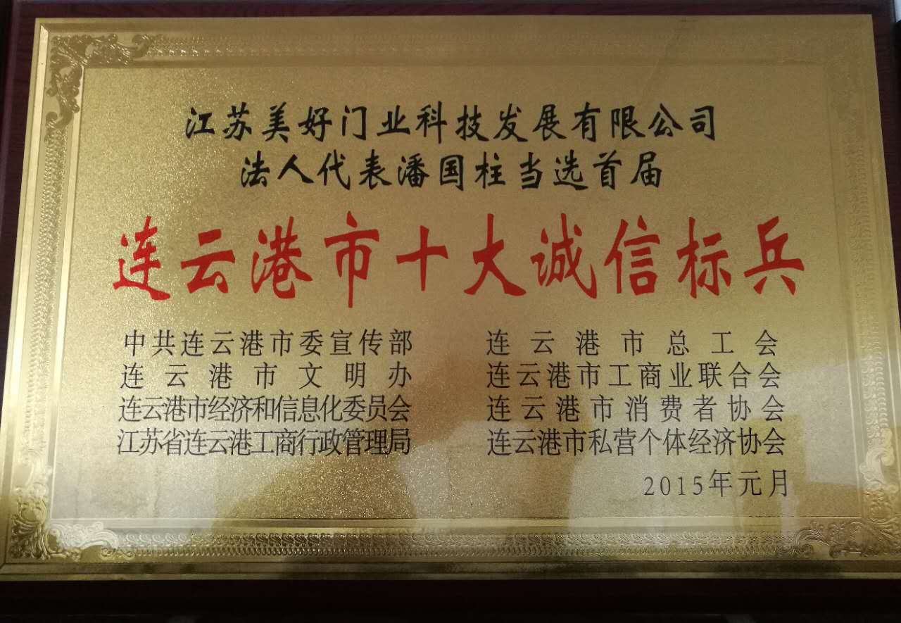 江蘇美好門業(yè)科技發(fā)展有限公司法人代表潘國柱當(dāng)選首屆連云港市十大誠信標(biāo)兵